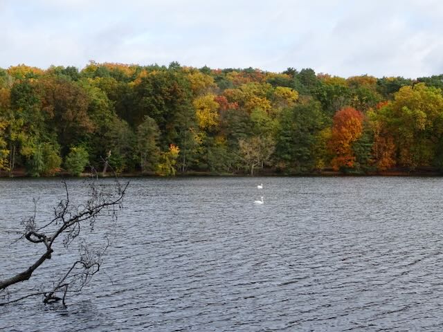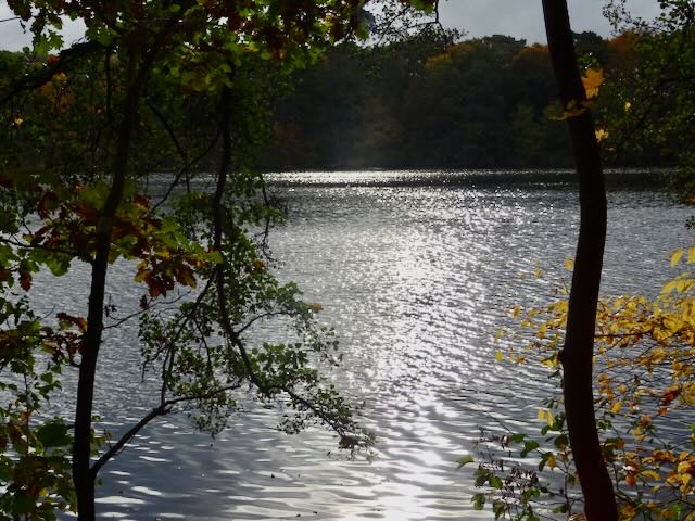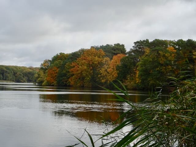 ベルリン郊外の湖(シュラハテンゼー)の周りの木も紅葉し(写真)、湖の遊歩道は黄色や赤色の落ち葉の絨毯のようだ。水面に、白鳥や黒いアオサギがたむろしている。