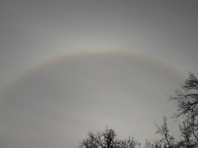 太陽が少しでいるので、太陽の光が雲に輪っかをかけ、虹のようにも見える。