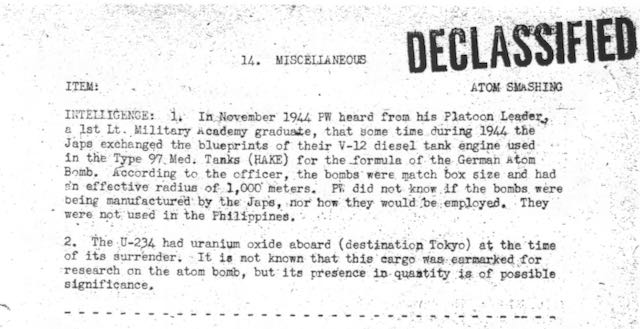 1944年11月、陸軍士官学校卒第1軍曹の小隊長から、日本が1944年に何回か、97式中戦車ハケ(註:原文の「ハケ」は間違い。正確には「チハ」のはずだ)に利用される戦車用V型12気筒ディーゼルエンジンの青焼き図面と交換に、ドイツ式原爆の構造図を手に入れたと聞いた。小隊長によると、爆弾はマッチ箱1つ程度の大きさで、半径1000メートル程度の破壊力がある。