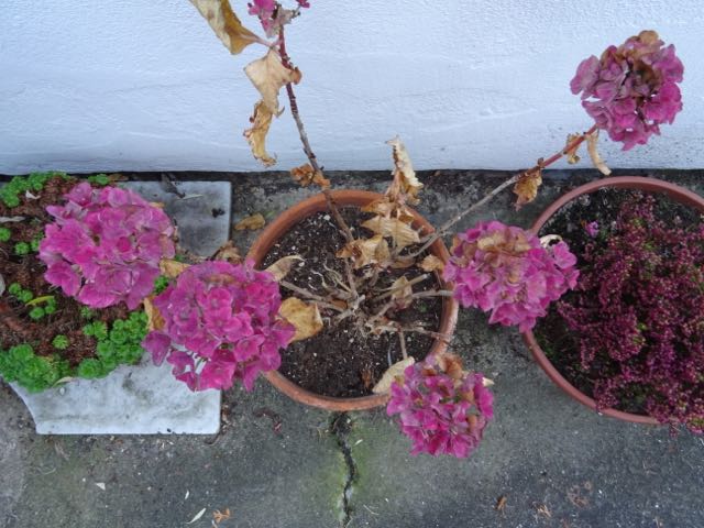 今年、もう一つ珍しいのはアジサイの花だ。アジサイはよく、葉っぱが枯れても、老化した花がより赤くなって咲いていることがある。そのうちに花もかれていく。だが今年は、まだ花びらもしっかりして、花が赤々と眩しいくらいに咲いている。