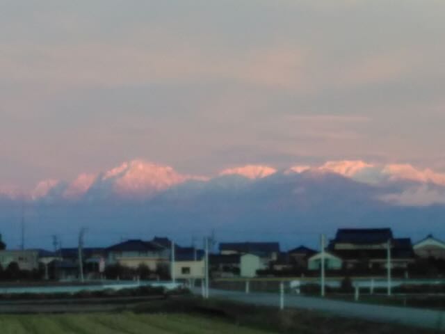 天気がよく、雲もなければ、立山連峰が見える。左側に高く飛び出ている山は、剱岳だと思う。夕方、郊外のスーパーマーケットの駐車場から撮った。ぼくはこの景色を見ながら、大きくなった