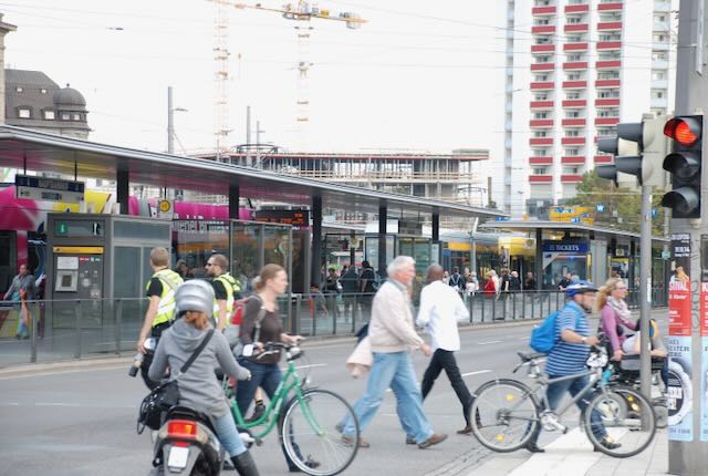 ドイツ東部ライプツィヒ駅前を歩く人たち